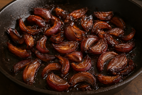2. Mezitím na pánvi pomalu restuj na proužky nakrájenou cibuli. Jakmile změkne, přidej vinný ocet a med. Nech zredukovat na sirupovitou konzistenci.